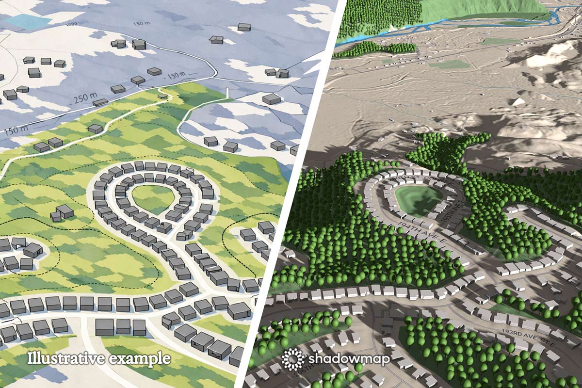 Shadowmap calculates building shadows, terrain shading and vegetation impact simultaneously on the same map.