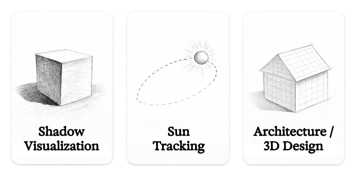 “Shadow Visualization Tools”, “Sun Tracker Tools” and “Architecture & CAD Tools” refer to typical feature sets of these tool categories. Individual products may vary.