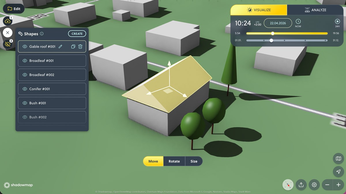 These objects interact with sunlight and shadows in real time, making Shadowmap suitable for conceptual design, solar planning and feasibility studies.